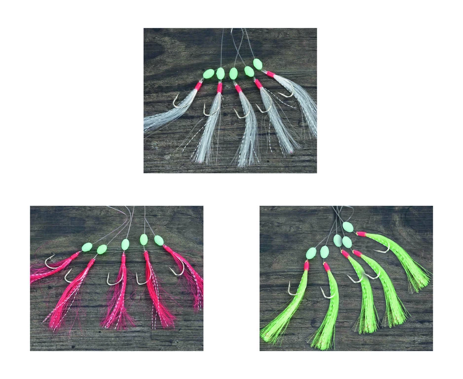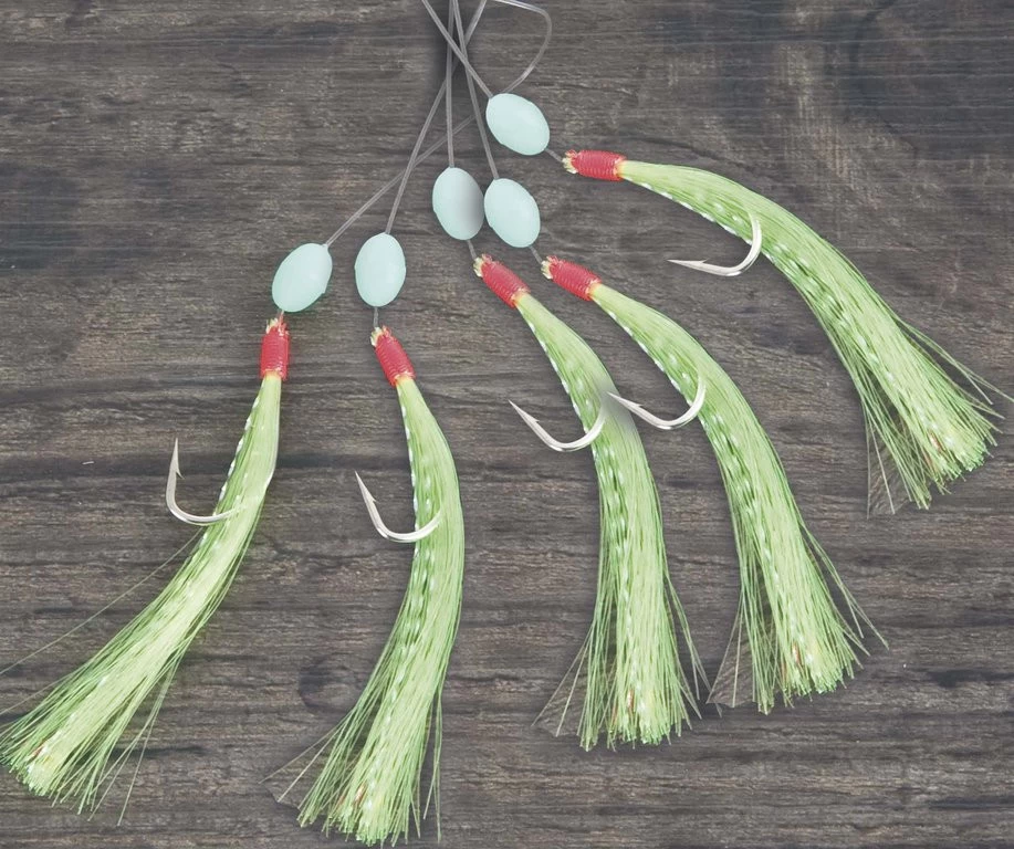 Dieses starke Makrelen- und Pilkvorfach besitzt 5 Cristal Haken, Fluolockperlen und hat farbige Federn mit Tinsel. Diese Vorfach gibt es mit weißen, roten und chartreusen Federn.