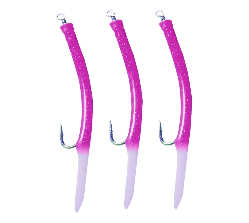 Diese selbstleuchtenden Gummi-Makks besitzen stabile Makk-Haken. Der Leuchtschlauch überzieht diesen gebogenen Haken und ist mit einem Karabiner-Wirbel bestückt. Die Makk sind zweifarbig mit Glitter und einem Leuchtende. Es gibt diese Makks in drei Farben und einen Mix. Die Hakengrößen reichen von 4/0 bis 12/0. In jeder Packung sind 3 gleichfarbige Makks enthalten (außer 12/0 – 2 Stück). Beim Mix ist von jeder Farbe ein Makk enthalten (außer 12/0 – 1x Schwarz + 1x Rot).