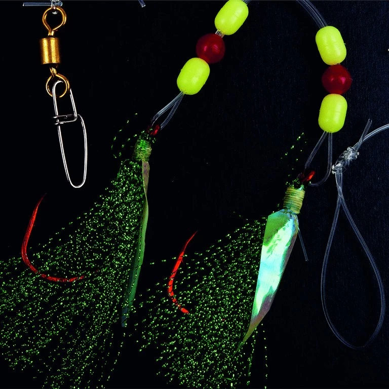 Das Vorfach besteht aus zwei Dorschfliegen mit Haken der Größe 5/0. Die Dorschfliegen haben grüne Federn und sind an einer 0,60mm starken Hauptschnur befestigt.