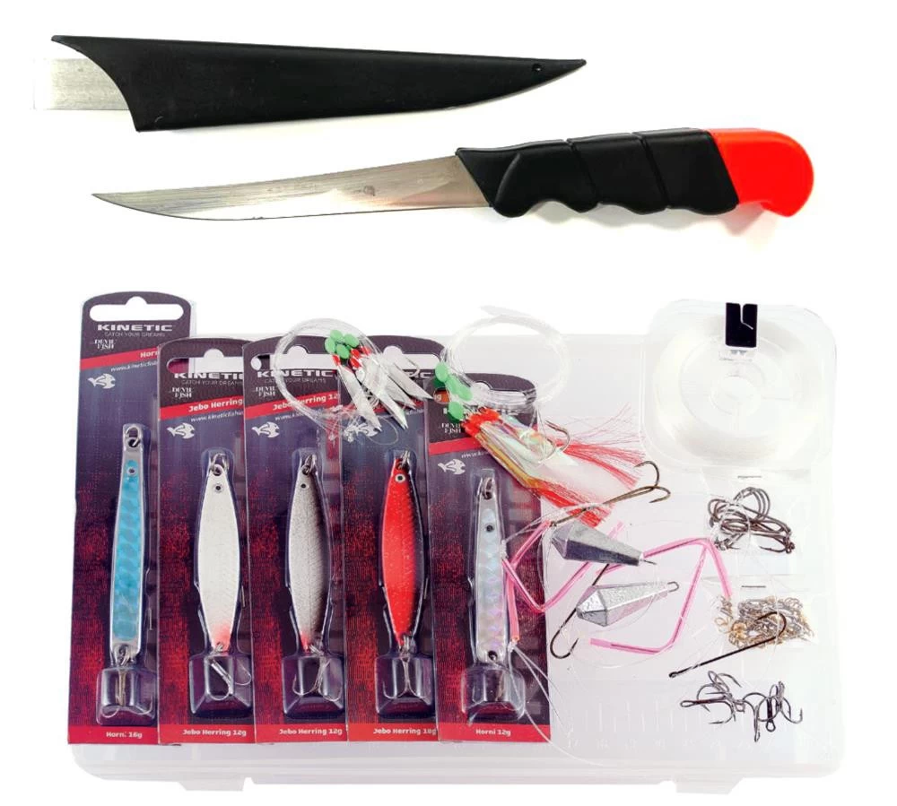 Dieses 39-teilige Küsten-Set von Kinetic beinhaltet eine Köderbox in der ein schwimmendes Filetiermesser mit Scheide, 5 Meerforellen- und Hornhechtblinker, 2 Schwimmer, 2 Plattfisch-Vorfächer mit Gewicht, Vorfachschnur, 2 Makrelen-Vorfächer, 5x Drillinge, 10x Einzelhaken und 10 Wirbel mit Einhängern verstaut sind.