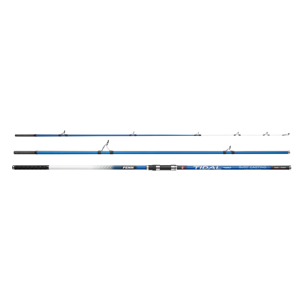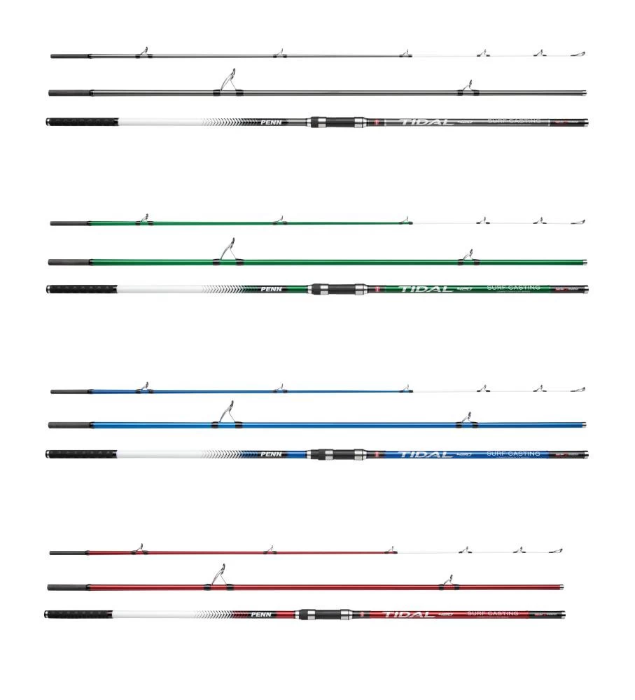 PENN Tidal ist die neue und exklusive Surfcasting Serie von PENN. Tidal Ruten stehen fĂĽr alles, was man zum Surfcasting braucht: Superstarke, aber leichte und reaktionsfreudige 30T Carbonblanks, die auf beste Distanzeigenschaften ausgelegt sind. Alle Ruten sind mit einer Sensitip Spitze kombiniert, um auch die kleinsten Bisse anzuzeigen. Alle Blanks wurden in Zusammenarbeit mit Surfcasting-Experten in ganz Europa entwickelt, um Ihnen die bestmöglichen Blanks zu bieten – ein unglaubliches Preis-Leistungs-Verhältnis. Die speziellen K-Ringe sind verwicklungsfrei und Salzwasser-sicher, so dass Sie auch bei Wind keine Probleme beim Werfen haben werden. AuĂźerdem sind alle Ruten mit einem komfortablen Shrink-Wrap-Griff und einem speziellen Wurfgriff ausgestattet. Die Rutenserie besteht aus vier einzigartigen Modellen, die sich durch die Farbe unterscheiden – alle sind unterschiedlich stark. Die metallisch silberne PENN Tidal (50-200g) ist fĂĽr die leichteren Angelstile wie z.B. das Strandangeln oder das Angeln vom Steg aus gedacht, bei denen kein schweres Gerät benötigt wird. Die grĂĽn-metallic (100-225g) und blau-metallic (100-250g) Versionen sind echte Allround-Surfcasting-Ruten, die unter allen Bedingungen eingesetzt werden können. Wenn es jedoch auf Weite und Kraft ankommt, ist die metallic-rote PENN Tidal (100-300g) die Rute, die Sie brauchen, um den Job zu erledigen.