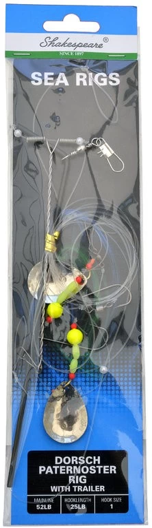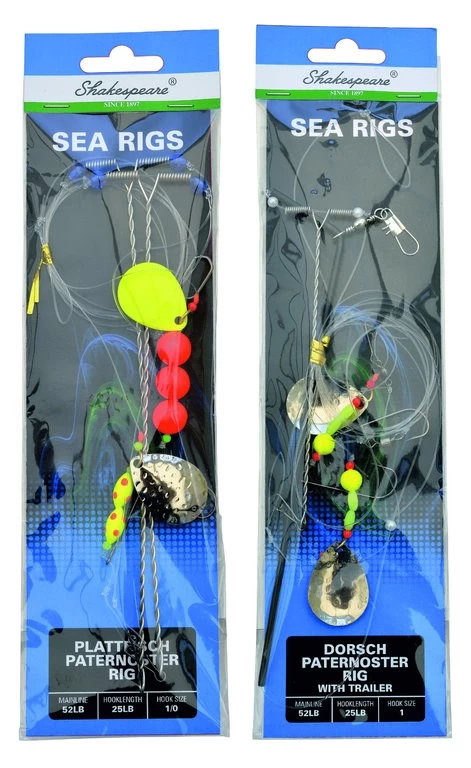 Dieses Plattfischvorfach gibt es in 2 Ausführungen. Beide Typen besitzen zwei Haken, Lockperlen und Spinnerblätter. Sie unterscheiden sich dadurch, das eine Variante 2 Trailer besitzt, während die andere Ausführung zwei Abstandshalter besitztz. Die Ausführung mit Trailer hat zwei Haken der Größe 1 und die ohne Trailer zwei Haken der Größe 1/0. Beide Rigs haben eine Hauptschnur mit einer Tragkraft von 52lb (24kg) wobei die Vorfachschnur der Seitenarme eine Tragkraft von 25lb (11kg) aufweist.