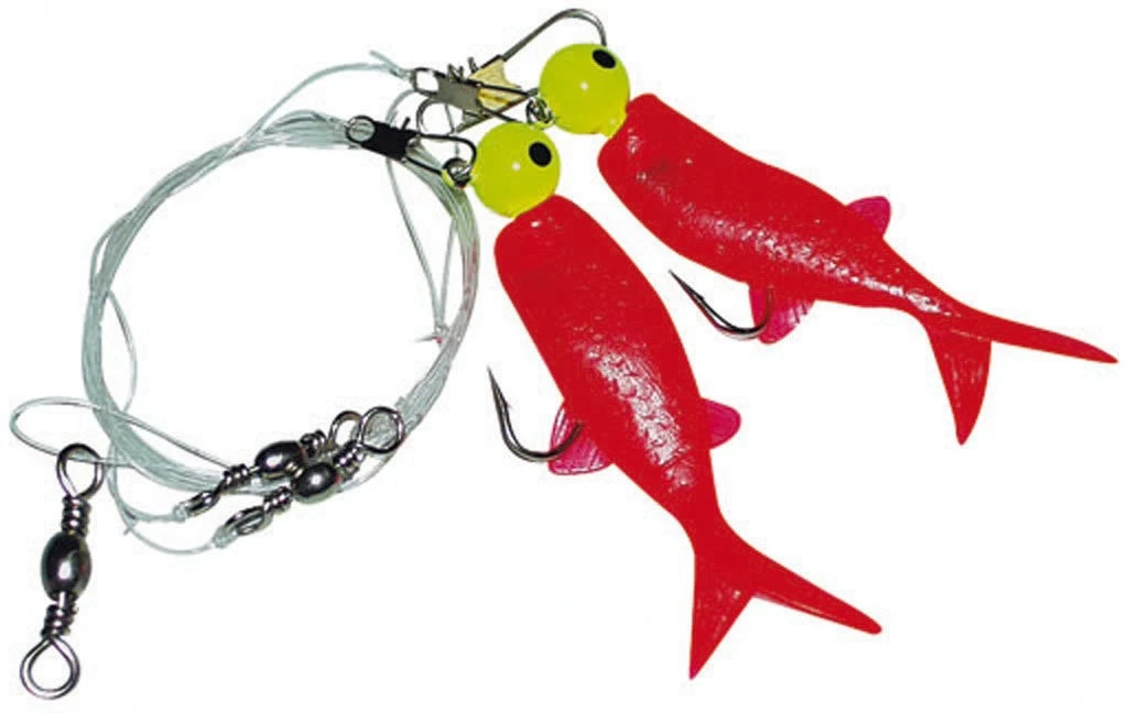 Dieses Vorfach besteht aus zwei Gummitwistern in Form von 2 roten Fischen. Diese sind jeweils an einem Haken der Größe 4/0 montiert. Die Twister haben ein Gewicht von 10g.